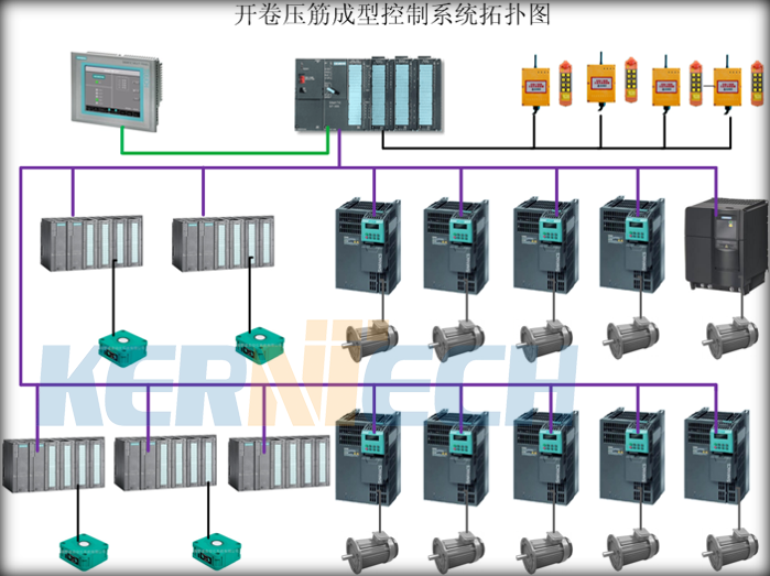 項目內容:系統采用西門子S7-300 PLC與多臺G120變頻器走DP通訊控制字對變頻器調速并顯示變頻器當前狀態,兩臺G120變頻器做同步控制,觸摸屏記錄修改板型,西門子S120網絡伺服控制。
