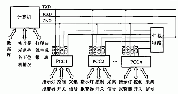 普通的RS-232采用點(diǎn)對點(diǎn)串行數(shù)據(jù)傳輸方式, 無法滿足多設(shè)備之間的實(shí)時通信, 因此需要對其連接方式作一些改進(jìn)。RS-232的點(diǎn)對點(diǎn)通信是將接口的數(shù)據(jù)發(fā)送端(TXD)連接到另一方的數(shù)據(jù)接收端(RXD) , RXD與另一方的TXD相連,雙方的地線端(GND)直接相連。但在計(jì)算機(jī)與多臺PCC相連時則發(fā)生了一些變化。如圖2所示,計(jì)算機(jī)的數(shù)據(jù)發(fā)送端直接連接到各PCC的數(shù)據(jù)接收端, 地端直接與各PCC的地端相連, 但各PCC的數(shù)據(jù)發(fā)送端不能同時連接到計(jì)算機(jī)的數(shù)據(jù)接收端, 因?yàn)閿?shù)據(jù)發(fā)送端在無數(shù)據(jù)發(fā)送時為高電平,而發(fā)送的數(shù)據(jù)為高低電平組成的脈沖序列, 直接將兩個或多個數(shù)據(jù)發(fā)送端連接到一起接入計(jì)算機(jī), 則會造成其數(shù)據(jù)接收端電平的不確定, 產(chǎn)生了數(shù)據(jù)沖突問題。為了解決上述問題設(shè)計(jì)了專門的硬件仲裁電路, 將各PCC的TXD 以及數(shù)據(jù)發(fā)送請求端(DTR)接入, 再將仲裁電路輸出端連接到計(jì)算機(jī)的數(shù)據(jù)接收端。