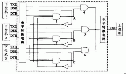 圖3 以三路PCC 為例說明。各下位機(jī)初始化時均將其DTR 設(shè)置為低電平, 因?yàn)榕c門1 、2 、3均有低電平輸入, 所以初始化后A、B、C 三點(diǎn)均為低電平, 并且與門4 、5 、6 也一直輸出低電平。假設(shè)下位機(jī)1 是第一臺要發(fā)送數(shù)據(jù)的下位機(jī), 發(fā)送前先將自己的DTR 端口設(shè)置為高電平, 而此時B、C 兩點(diǎn)仍為低電平, 經(jīng)反相器后變?yōu)楦唠娖捷斎肱c門1 , 所以與門1 的輸出A 點(diǎn)電平也為高, 此時數(shù)據(jù)發(fā)送服務(wù)程序讀取數(shù)據(jù)發(fā)送查詢端(DSR) 電平狀態(tài)(即A 點(diǎn)電平狀態(tài)) 為“1”, 說明總線未被占用,處于空閑狀態(tài)。由于下位機(jī)1 的DTR 端口已被置高, 且查詢得知總線空閑, 則其DTR 端口不變?nèi)匀辉O(shè)置為高電平, 這樣下位機(jī)1 就占用了總線, 可以開始發(fā)送數(shù)據(jù)。數(shù)據(jù)由TXD 端經(jīng)過與門4 后輸入上位機(jī)的RXD 端, 由于此時A 點(diǎn)電平為高, 保證了數(shù)據(jù)經(jīng)過與門4 后沒有失真直接上傳至上位機(jī), 同時A 點(diǎn)電平經(jīng)反相器后變?yōu)榈碗娖捷斎肱c門2 、3 , 故B、C 兩點(diǎn)電平為低, 與門5 、6 始終輸出低電平, 避免了數(shù)據(jù)沖突。當(dāng)下位機(jī)1 數(shù)據(jù)發(fā)送完畢后將其DTR 端口置低, A 點(diǎn)電平變低, 釋放了總線, 又回到初始化后的狀態(tài), 可以供給下一個要發(fā)送數(shù)據(jù)的下位機(jī)使用。假設(shè)下位機(jī)1 發(fā)送數(shù)據(jù)的過程中, 下位機(jī)2 也要發(fā)送數(shù)據(jù), 同樣先將自己的DTR 端口置高, 但此時A 點(diǎn)電平為高, 經(jīng)反相器后輸入與門2 , 所以與門2 的輸出B 點(diǎn)仍為低電平, 程序讀取DSR 端口電平(即B 點(diǎn)電平) 為“0”, 說明總線已被占用, 因此將DTR 端口重新置低, 等待下次查詢, 這樣就避免了兩臺下位機(jī)同時上傳數(shù)據(jù)。下一個查詢周期未到時, 程序持續(xù)查詢是否有更高優(yōu)先級的任務(wù)標(biāo)志位置位, 有則調(diào)用相應(yīng)的任務(wù)服務(wù)程序, 沒有則重復(fù)查詢各標(biāo)志位直至下一個查詢周期到來; 下一個查詢周期到來后,重復(fù)一次置高DTR 端口、讀取DSR 端口的過程以判斷總線狀態(tài), 空閑則DTR 端口保持高電平占用總線并發(fā)送數(shù)據(jù), 否則置低DTR 端口, 等待下次查詢。下位機(jī)2 重復(fù)上述過程直至查詢到總線空閑并占用總線以發(fā)送數(shù)據(jù)。