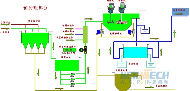 預(yù)處理部分基本工藝介紹:一級(jí)提升泵3臺(tái)11KW從原水池把水送入調(diào)節(jié)塵沙池,經(jīng)過(guò)沉淀后自動(dòng)流入調(diào)節(jié)水池,由二級(jí)提升泵3臺(tái)11KW送入機(jī)械澄清池,輸送過(guò)程中進(jìn)行加藥處理(絮凝劑投放,助凝劑投放,次氯酸鈉投放),機(jī)械澄清池設(shè)置刮泥機(jī)和攪拌電機(jī),然后進(jìn)入重力無(wú)砂濾池,再自動(dòng)流入中間水池,塵沙池和機(jī)械澄清池的污泥通過(guò)水池下部流入污泥脫水池,排砂泵1.5KW進(jìn)行污泥脫水外運(yùn)。如下圖: