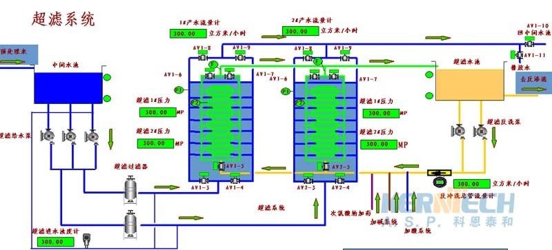 超濾部分基本工藝介紹:超濾供水泵3臺(tái)22KW,超濾反洗泵2臺(tái)45KW,超濾供水泵從中間水箱抽水經(jīng)過(guò)超濾過(guò)濾器進(jìn)入兩套超濾系統(tǒng),對(duì)濁度進(jìn)行監(jiān)控,同時(shí)超濾一次測(cè)和二次測(cè)分別加裝壓力表和流量計(jì),對(duì)產(chǎn)水進(jìn)行統(tǒng)計(jì)。進(jìn)入超濾產(chǎn)水箱,通過(guò)超濾反洗泵進(jìn)行定期超濾系統(tǒng)的清洗。清洗水中進(jìn)行加藥處理(加酸,加堿,加次氯酸鈉)同時(shí)增加流量計(jì)。如下圖:
