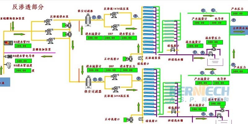 反滲透部分工藝介紹:反滲透15KW供水泵三臺(tái),反滲透37KW高壓泵4臺(tái),超濾出水后增加溫度,電導(dǎo)率,PH值監(jiān)測(cè),進(jìn)行加酸加堿加藥,通過(guò)反滲透供水泵,保安過(guò)濾器,在經(jīng)過(guò)反滲透高壓泵進(jìn)入2套反滲透系統(tǒng),監(jiān)測(cè)流流量,ORP,和管道壓力,經(jīng)過(guò)反滲透后,進(jìn)入濃水水箱,監(jiān)測(cè)濃水管道壓力和流量。原凈水池安裝三臺(tái)輸送泵,監(jiān)測(cè)流量和壓力,配合反滲透的產(chǎn)水后進(jìn)入回用水水池。如下圖: