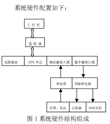 塑料擠出機的控制系統包括加熱系統、冷卻系統及工藝參數測量系統,主要由觸摸屏,PLC 和變頻器,傳感器等組成。其主要作用是:控制和調節主輔機的拖動電機,輸出符合工藝要求的轉速和功率,并能使主輔機協調工作;檢測和調節擠塑機中塑料的溫度、壓力、流量;實現對整個機組的控制或自動控制。系統硬件結構如圖一所示,具體如下: