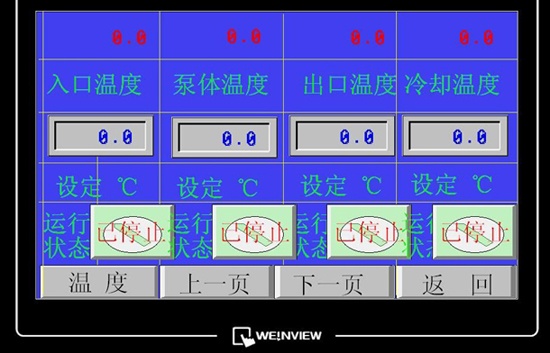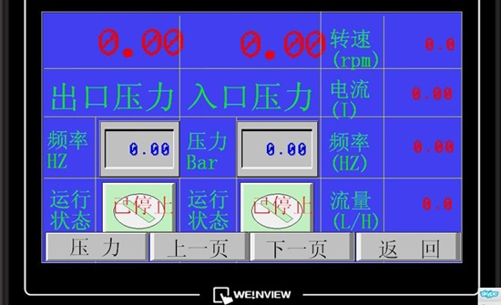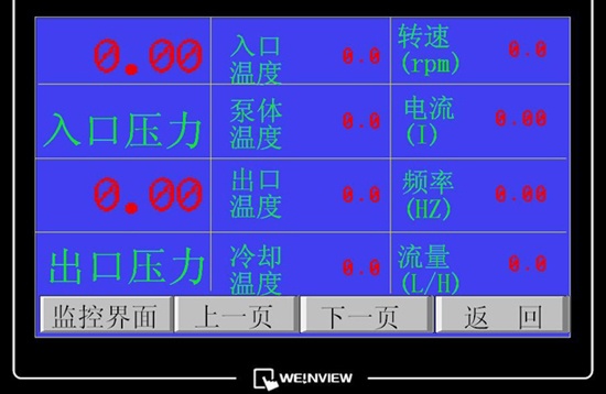 主畫面需要顯示當前的入口和出口壓力,各分區溫度值和電流,轉速,流量等,如下圖所示