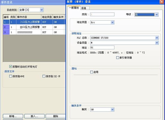 事件登錄元件的使用,可以及時查看報警信息的顯示,設置如下所示