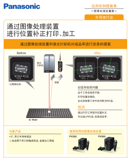 通過(guò)圖像處理裝置和激光打標(biāo)機(jī)對(duì)成品率進(jìn)行改善的提案 以往存在的問(wèn)題由于工件會(huì)搖晃不穩(wěn),打印位置會(huì)錯(cuò)位,在出貨檢查工序中會(huì)判斷為NG品。 |