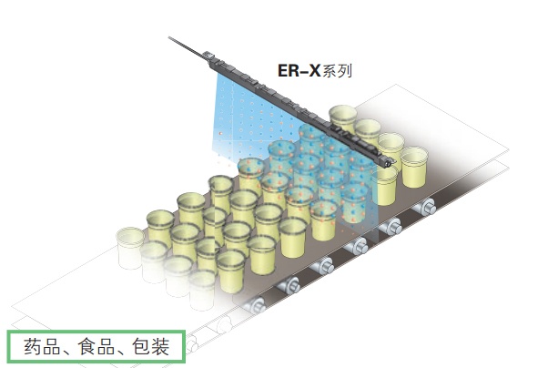 傳送食品杯時如果產生靜電,則可能會因吸附 灰塵或毛發而混入異物。ER-X系列可對成排 的許多食品杯進行大范圍的靜電消除和除塵。