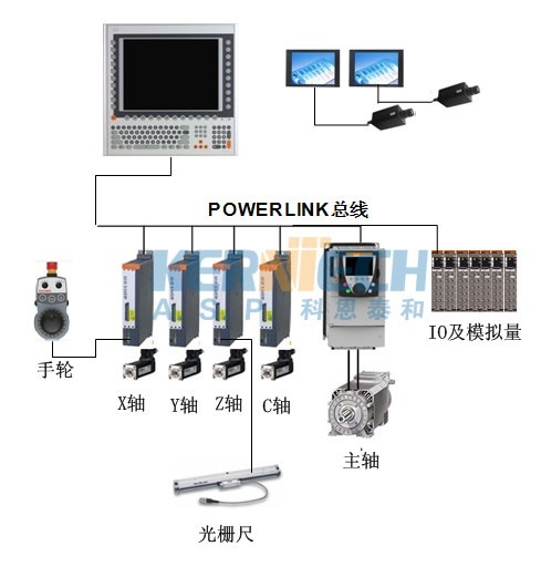 上位機系統采用了貝加萊的Power Panel 系列PP500工業PC,15寸顯示,中文界面,具備G代碼編程功能,具備時時多任務操作系統,支持總線協議,包括PowerlinK,CanOpen,profibus_DP等通用總線協議。機床部分IO采用X20系列分布式IO模塊,連接伺服采用powerlink總線。