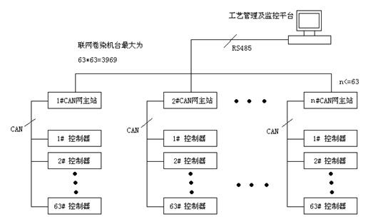 每一臺(tái)卷染機(jī)配一臺(tái)控制器,因此網(wǎng)絡(luò)結(jié)構(gòu)可以連接3969臺(tái)卷染機(jī)。工藝管理和設(shè)備狀態(tài)監(jiān)控均可在網(wǎng)絡(luò)平臺(tái)上執(zhí)行。