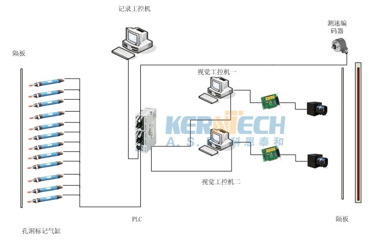 為了保證系統(tǒng)高速相應,每套視覺系統(tǒng)配備一臺工控機,同時為了保證監(jiān)測到的孔洞時時保留記錄打印,又配備了一臺工控機。系統(tǒng)控制的原理框圖如下: