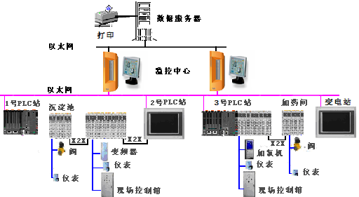 污水處理的工藝流程大體分為:格柵處理、泵房提升、沉砂處理、一次沉淀池、曝氣池處理、二次沉淀池處理、泥漿制備、昭氣利用。需要控制的區域主要有進水泵房,鼓風機房,脫水機房,變電所,加藥間等區域。有柵格、總泵房、沉砂池、生物反應池、沉淀池、加氯間、污泥處理裝置、變電站等控制對象。