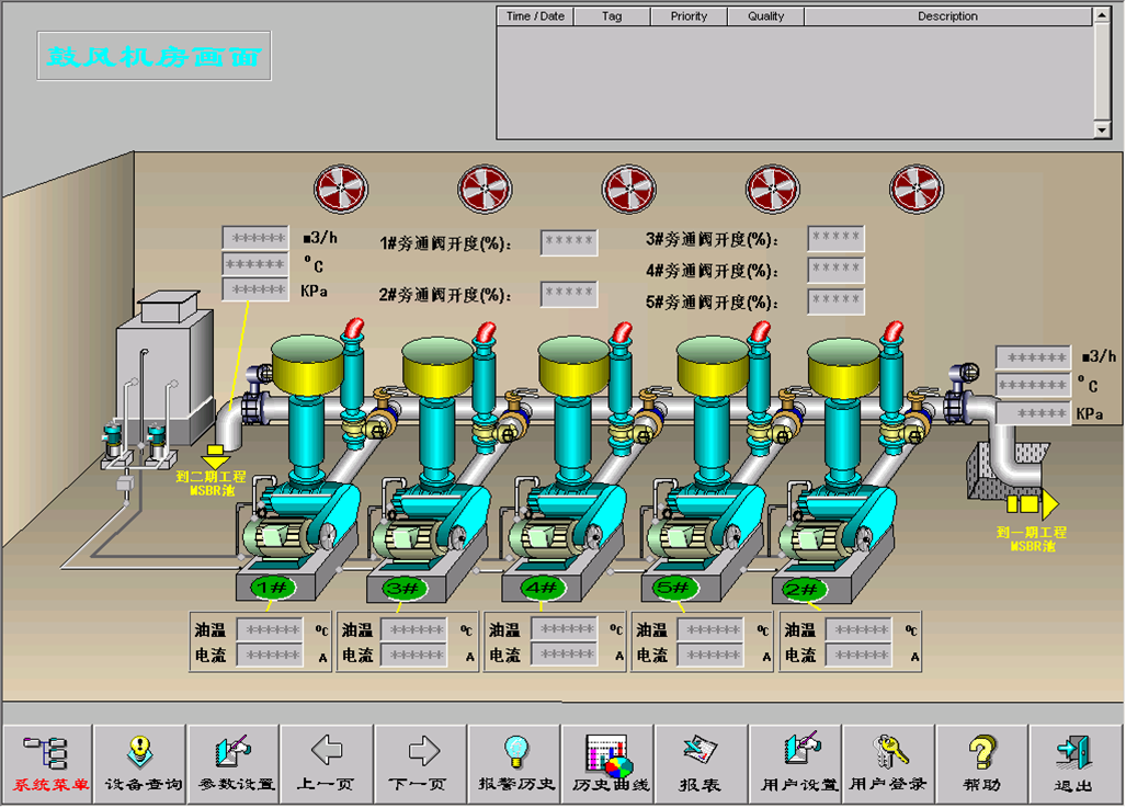 3個PCC站分別位于預處理站,鼓風機室,濾池和沉淀池。鼓風機房現場HMI采用貝加萊的PP100觸摸屏,PP100采用266MH高性能處理器,128MB DRAM,TFT 640*480 真彩10.4寸的大尺寸,IP65的防水等級。全金屬外殼。模擬電阻式觸摸屏其特性決定了長壽命,正常使用可達6年以上。并且具有很強的抗干擾能力,并集成RS232,以太網,USB接口,方