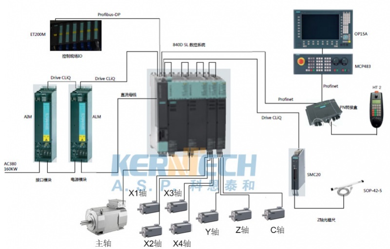 系統選用:上位機采用PCU50.3,預裝windows操作系統,HMI adv. sw7.6操作軟件,數控采用了840Dsl數控系統NCU710.3,自帶PNDP接口,內置S7-300 317-2DP的CPU。伺服系統采用S120驅動系統,支持DRIVE-CLiQ接口,伺服配線簡便。同時采用MCP483操作面板,HT2可視化操作手輪。