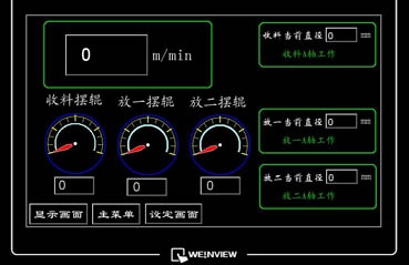 由于印刷機的長度過長,為了操作方便,在兩個不同的位置各放置一個觸摸屏:MT6100i和MT6070iH,在主人機界面(MT6100i)中,設計了4幅畫面,包括整體圖形、故障報警、機器速度和印刷控制。還有兩個自動彈出窗用于對電子凸輪參數(Q00 PLC內部地址)的修改,實現在線控制;另一個觸摸屏(MT6070iH)中,也設計了4幅畫面,包括印刷控制、水輥速度顯示、調版顯示和計數控制。故障顯示使用指示器,給出位元件即刻實現閃動效果,讓操作者很方便的知道故障部位,整體感很好。在水輥速度顯示中,設計了一個顯示圖,可以顯示水量增加大小,同時也可以方便監控。