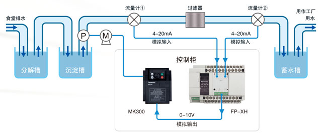 ■對工廠內食堂排水進行細菌分解,用泵汲取沉淀槽內蓄積的清水,經過過濾器過濾后,作為工業用水送至蓄水槽。