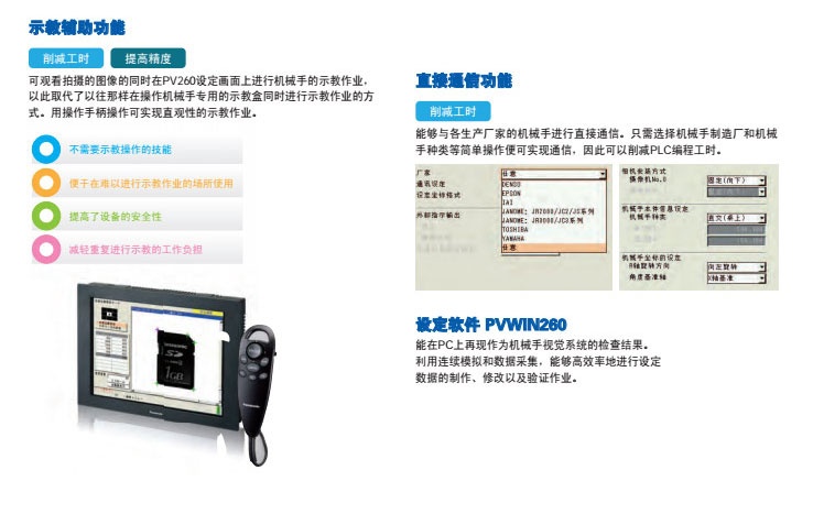 可觀看拍攝的圖像的同時在PV260設定畫面上進行機械手的示教作業,以此取代了以往那樣在操作機械手專用的示教盒同時進行示教 作業的方式。用操作手柄操作可實現直觀性的示教作業。