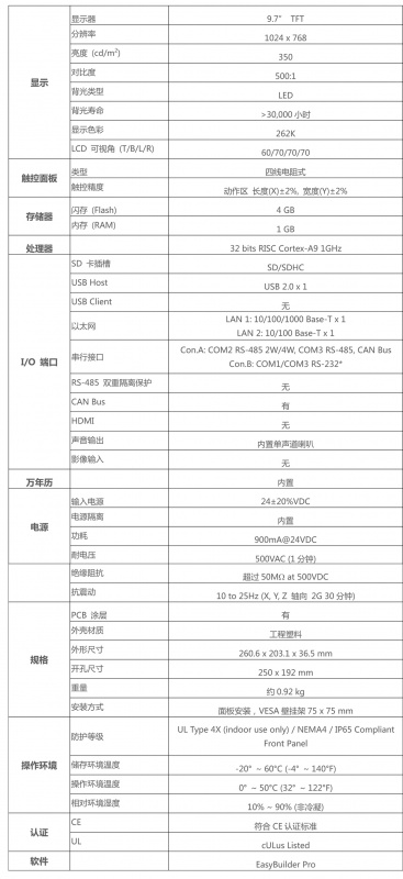 9.7" 1024 x 768 TFT LCD, 無風扇冷卻系統(tǒng), 內(nèi)置4 GB 閃存及萬年歷, 支持SD 卡擴充儲存容量,