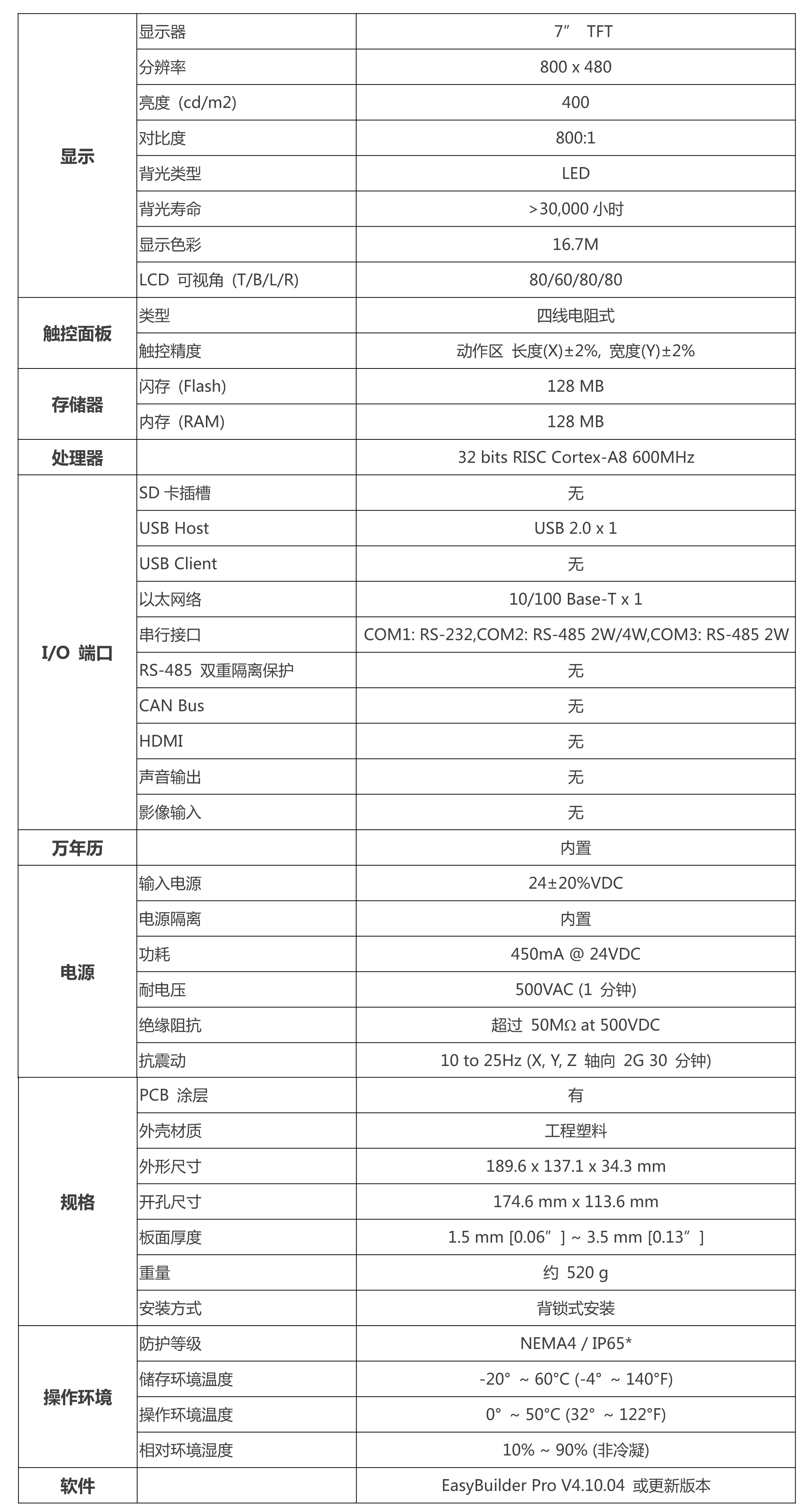 7" 800 x 480 TFT LCD, LED 背光,客制化設計控制盤面與銘版