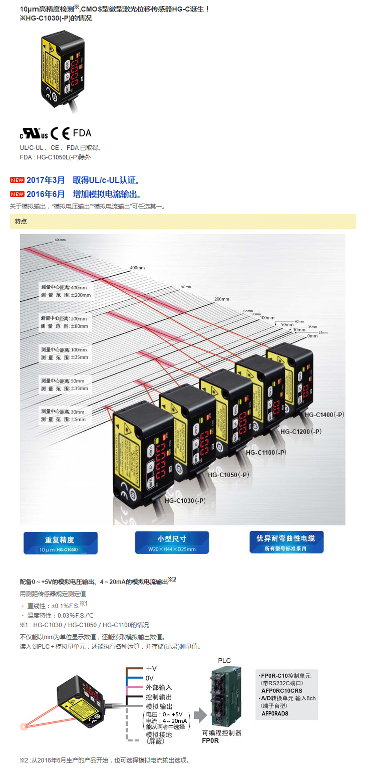 測量中心距離200mm型/400mm型、陶瓷檢測用微型激光位移傳感器HG-C1050L現(xiàn)已上市!